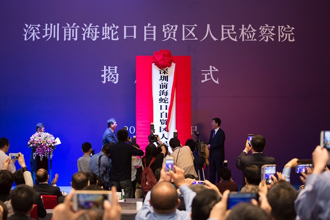 前海是国家批复的唯一一个社会主义法治示范区。前海蛇口自贸片区充分发挥法治优势,率先形成法治化、国际化、便利化的营商环境。昨天,前海人民检察院正式成立。最高人民检察院检察长曹建明、广东省委副书记、深圳市委书记马兴瑞为前海人民检察院揭牌。
