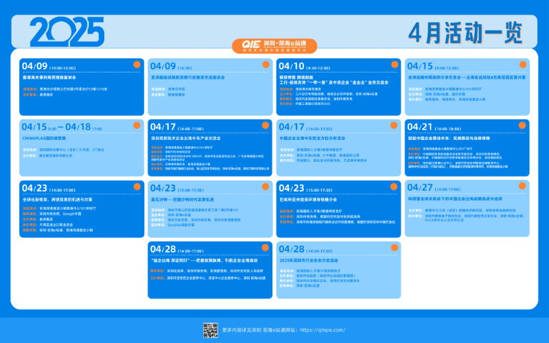 四月的14场活动,是深圳·前海e站通助力中企出海的生动实践,更是其打造国际化服务平台的坚实脚印。为进一步响应企业差异化需求,深圳·前海e站通五月份将聚焦建筑、医疗、游戏等战略新兴领域推出系列垂直化、精细化的出海赋能活动,助力企业精准锚定全球市场机遇。
