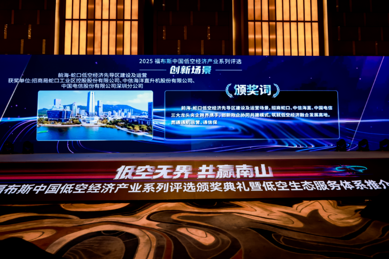 在下午举行的福布斯中国低空经济产业系列评选颁奖典礼上,前海-蛇口低空经济先导区建设及运营项目斩获“创新场景奖”。