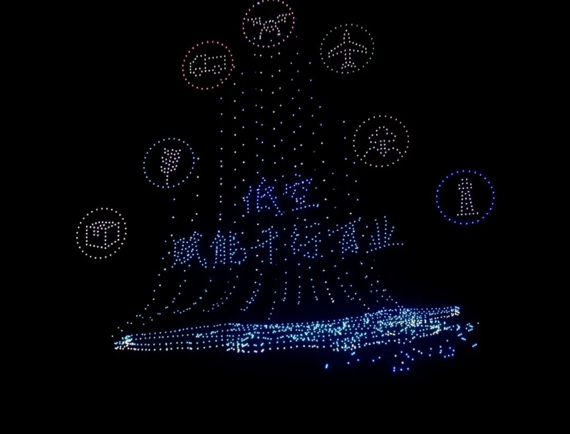 夜幕降临,2000架无人机在会场外腾空而起,以天为幕,编织组成绚丽的动态画卷,用科技之美点亮湾区夜空。