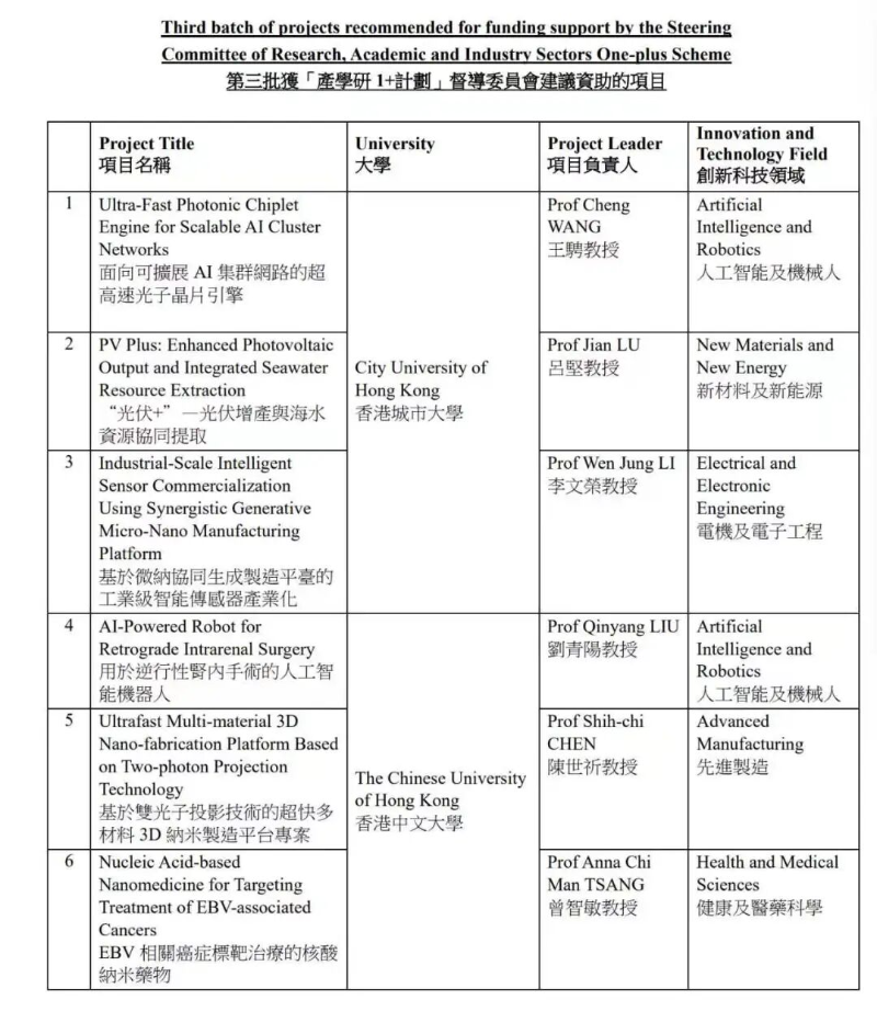 4月20日,香港创新科技署公布第三批24个获“产学研1+计划”(RAISe+),督导委员会建议资助的项目总资助金额超过10亿港元。