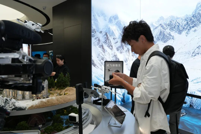 这家距离影石深圳总部仅一公里的旗舰店,试图用空间设计重构科技消费品的线下体验。记者在现场看到,门店将全场景全线产品悉数陈列,还引入了国内首个颠倒镜像微观模型,全景式还原骑行、滑雪等运动场景。此外,店内还有业内首个全景场景试飞区,供消费者直接上手测试无人机产品。